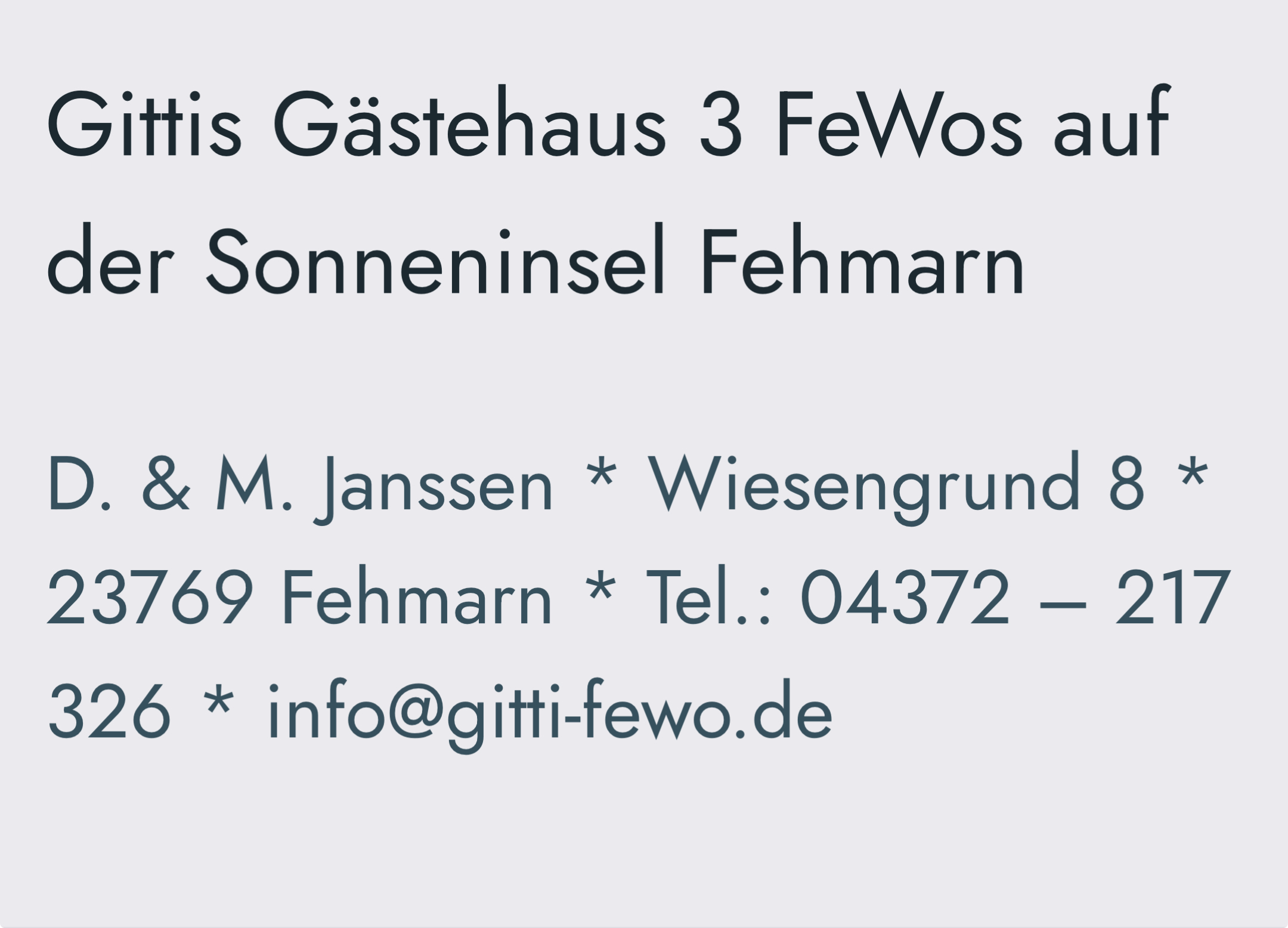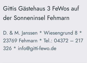 D. & M. Janssen * Wiesengrund 8 * 23769 Fehmarn * Tel.: 04372 – 217 326 * info@gitti-fewo.de